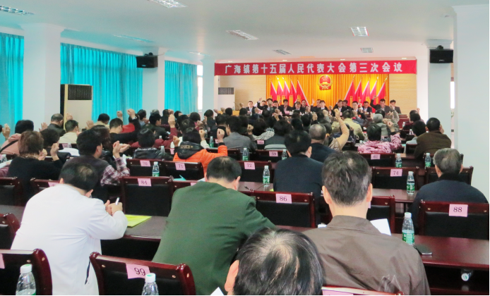 2013年1月31日上午,广海镇召开第十五届人民代表大会第三次会议。大会上,梅立全镇长作《政府工作报告》,人大副主席龚建华作《人大工作报告》。大会通过了《政府工作报告决议》、《财政预算草案报告决议》和《人大工作报告决议》,胜利闭幕。