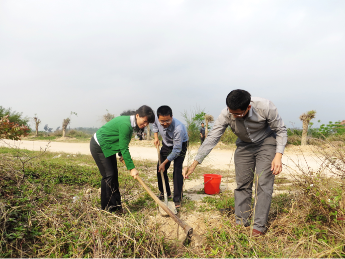 3月12日上午,广海镇政府机关干部职工和派出所武警官兵驱车前往大沙工业区工业一路开展植树活动。镇党委书记梁小青、镇长梅立全和党委委员陈行芳首先带头植树,同志们也个个热情高涨,用铁锹、水桶等工具给小树苗挖坑、埋土、浇水,共种下180棵木麻黄,为美丽的广海再添新绿。