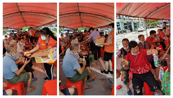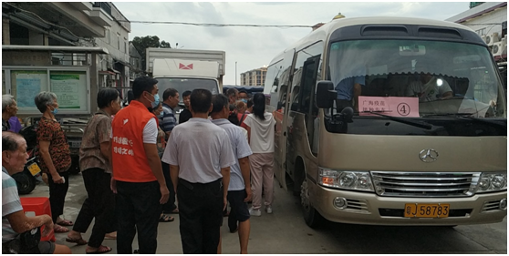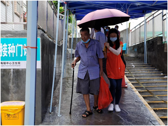 三、宣传发动,暖心服务。为更好更快推进疫苗接种工作,广海镇推出多项措施:一是提前通知。充分利用短信平台、派发传单、微信朋友圈、电话提前联系告知群众接种时间、注意事项,避免群众错过接种时间。二是免费接送。在镇域内4台专车免费接送打疫苗群众,在用车紧张时段,镇村干部更是提供私家车接送服务,保障群众顺利出行接种。考虑到外出务工乡亲在城市预约接种等待时间较长的问题,广海镇鼓励外出务工乡亲回乡接种,并为7月30日至31日在广海卫生院接种的群众报销来回程车费。三是激励发动。广海镇积极联系发动商超,在热心商家的支持下推出激励措施,凡是7月30日至31日到广海卫生院接种的群众可领取鸡蛋一份,政企合力同心推进防疫工作。四是贴心关怀。广海镇充分考虑近期天气因素,预先在广海中心卫生院等候区搭起帐篷,配备凳子和冷风扇,志愿者坚守岗位维持秩序,耐心协助群众填写表格,引导群众有序接种,并为等候接种的群众提供茶水、点心。