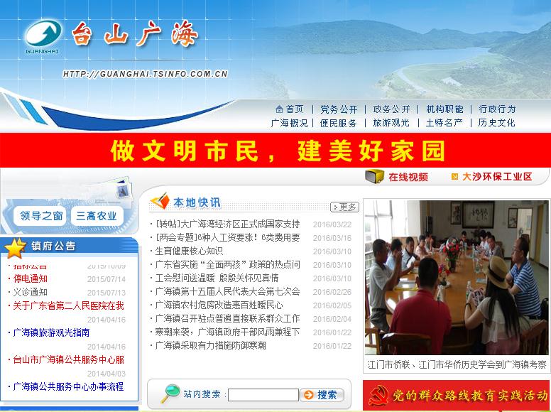 2015年,在市有关部门的指导下,广海镇严格按照《国务院办公厅关于开展第一次全国政府网站普查的通知》(国办发〔2015〕15号)和市政府有关信息公开工作的要求,对广海镇政府网站开展检查整改,切实提高政府网站的信息发布、互动交流和便民服务水平,全面推进信息公开工作。