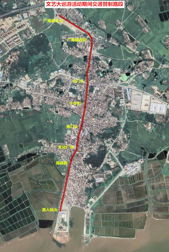 交通管制路线:广海新车站——政府——北门头——十字街——南门头——文化广场——海傍路——渔人码头。届时该路段将实行交通管制,禁止一切车辆通行和停放。