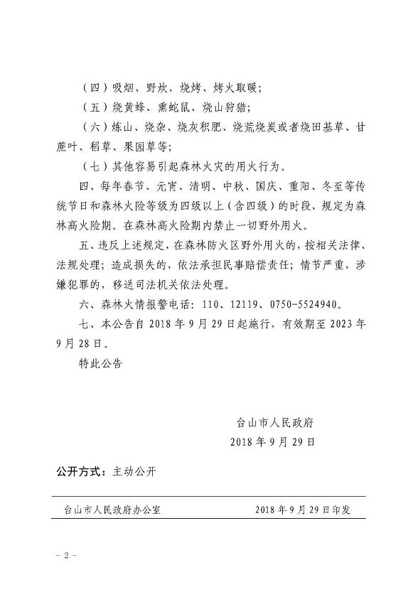 为让群众度过一个愉快的重阳节,防止山火发生,海宴镇委、镇政府依据《台山市人民政府关于发布森林防火禁火令的公告》和《关于划定台山市森林防火区的公告》(台府〔2018〕12号)的要求,重阳节期间,我镇辖区内全天候禁止车辆和游人携带火种、管制刀具、香烛纸宝、烟花炮竹和其它易燃易爆物品进山,禁止燃放孔明灯,禁止一切体育、娱乐、广告性等“低慢小”飞行活动。