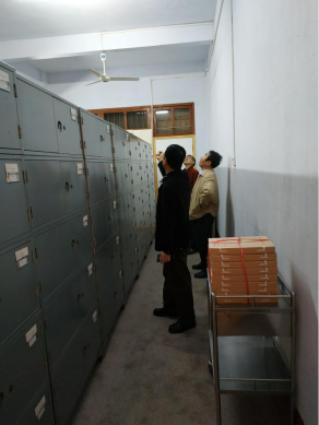 期间,焕权、景来同志仔细对档案专用库房设施、消防系统、温度调控系统、电器电线安全、卫生等情况进行详细检查,并提出相关的意见和建议。